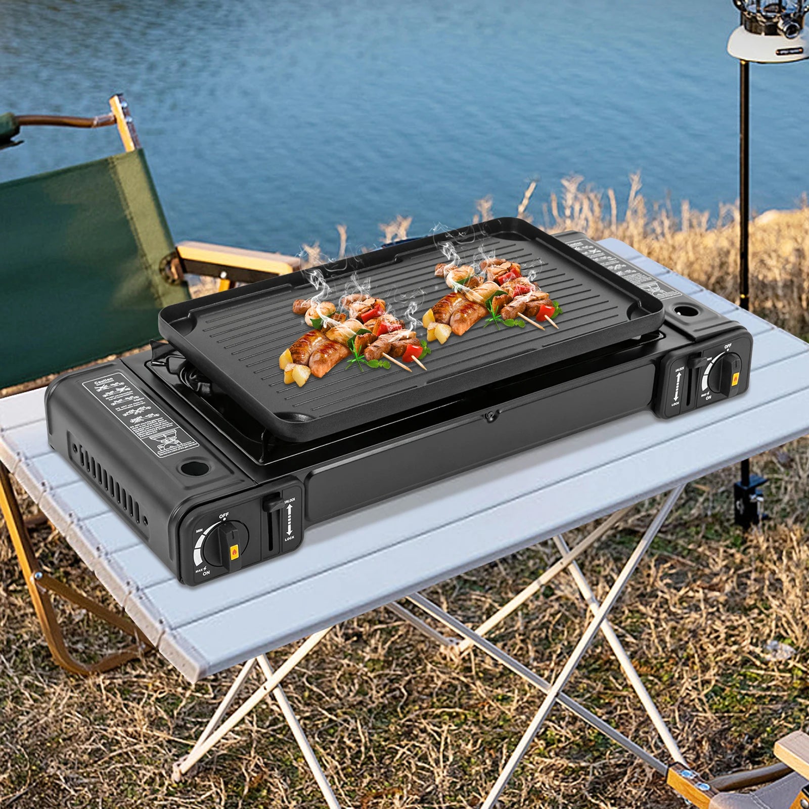 Camping Stove Dual Burner with Grill Tray and Storage Case is a versatile outdoor cooking solution designed for campers, hikers, and outdoor enthusiasts. Its dual burners and integrated grill tray let you sear, simmer, and boil all in one compact unit. The included storage case makes transport and organization effortless, whether you're hitting the trail or enjoying backyard campouts.